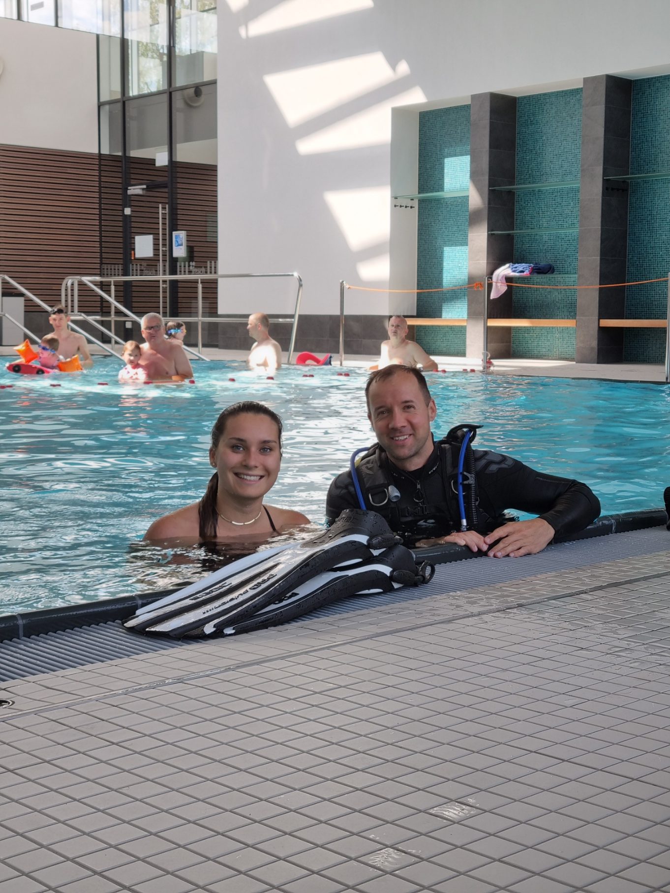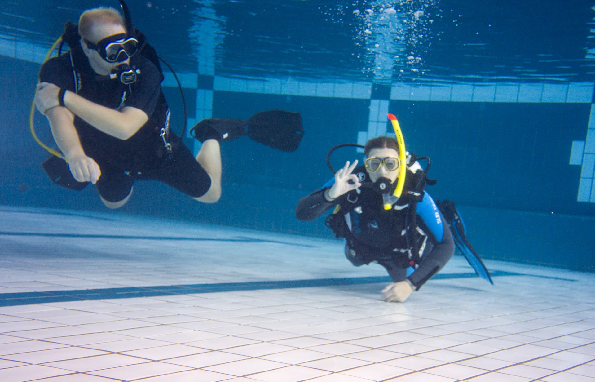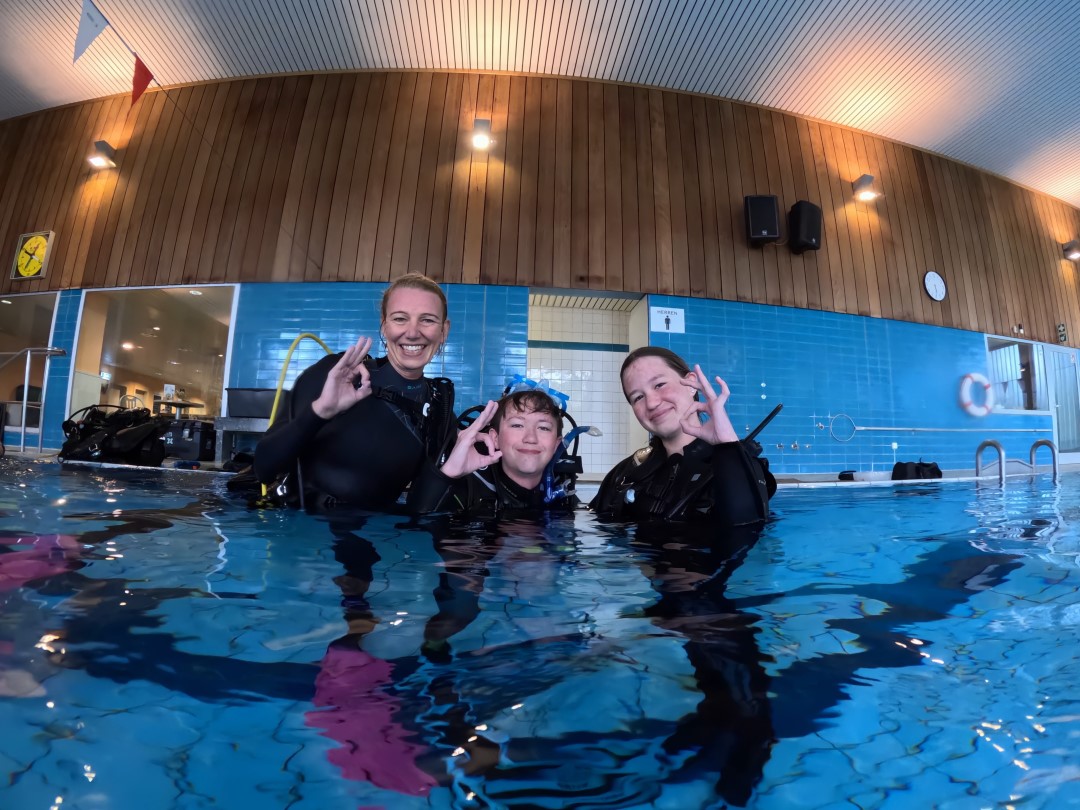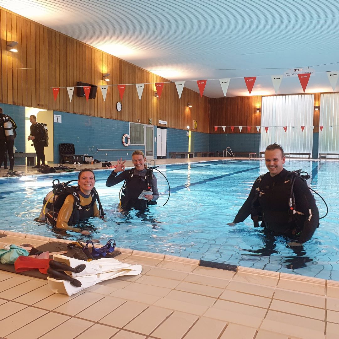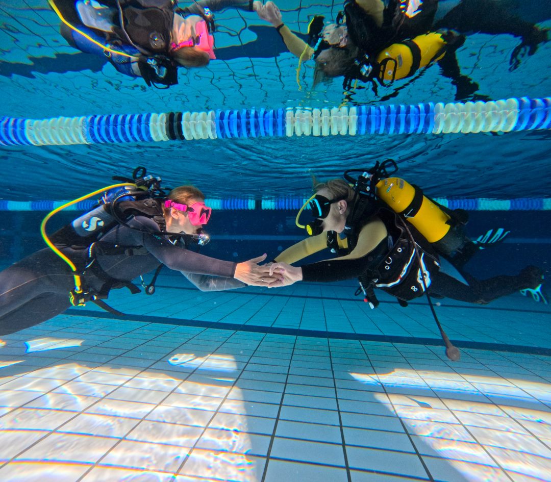 Bevor’s tiefer geht, übst du im Pool. Du lernst z. B., wie du richtig mit der Ausrüstung umgehst, wie du deine Tarierung kontrollierst, wie du die Maske unter Wasser leerst, was zu tun ist, wenn du mal keinen Luftpartner hast, und vieles mehr.